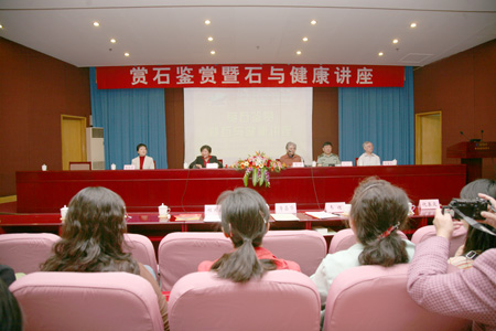 5?日上午,中国观赏石博览会•2008携手奥运北京精品展系列活动之一——赏石鉴赏暨石与健康讲座在我校国际交流中心学术报告厅举行,讲座由中国观赏石协会会长、国土资源部原副部长寿嘉华主持。我校部分师生员工及来自国内外的赏石届人士聆听了讲座?/p> 中国女科技工作者协会会长、教育部原副部长韦钰做简短致词。对本此展会成功举办表示祝贺,对我校为展会所作的工作表示感谢。强调展会对于促进人文奥运、绿色奥运具有积极意义,女性在弘扬中华文化和赏石文化中是举足轻重的力量。希望更多的女性汇入到赏石文化建设的潮流中,为我国文化的大发展、大繁荣贡献力量?/p> 中国人民解放军防空指挥学院政委少将张训彩和中国科学院地球化学研究所研究员倪集众,分别作了观赏石与健康和观赏石鉴赏石石不能言最可人的讲座?/p> 他们在讲座中阐释了观赏石与健康的关系,即观赏石与生存健康,观赏石与身体健康,观赏石与心理健康,观赏石与人格健康,观赏石与生态健康。从现实的角度而言,石对人类社会的发展贡献巨大,石是人类最早的劳动工具,石还有医疗保健的作用;从更高的层次上讲,石者通灵性,解人意,沉静淡泊,人往往能从观赏石的独特造型和妙音佳色之中获得空间艺术感知与共鸣,提升人自身的境界,通过赏玩观赏石达到人与自然的和谐,促进人与人之间的和谐,促进人与社会的和谐。向观众普及了观赏石的分类及鉴赏知识,并通过图像展示了各种各样精美的观赏石,让在座的观众大饱眼福,对观赏石鉴赏有了更加形象的认识和了解?br />